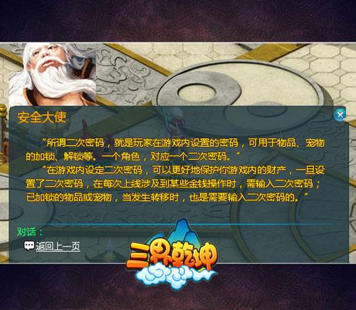 游戏内,通过【京都】城内新增NPC——安全大使,玩家可设定“二次密码”,用于对物品、宠物的加锁以及解锁等。每次上线时,凡涉及金钱的操作都需要输入“二次密码”进行确认。让玩家的游戏财产保护坚不可摧;