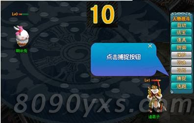 【2】在进行新手任务“捕捉宠物”时,进入战斗随机遇到3种兔子中其中一种。在战斗命令输入时间内点击“捕捉”按钮,鼠标变为捕捉图标时,点击兔子,进行捕捉,播放捕捉动画。