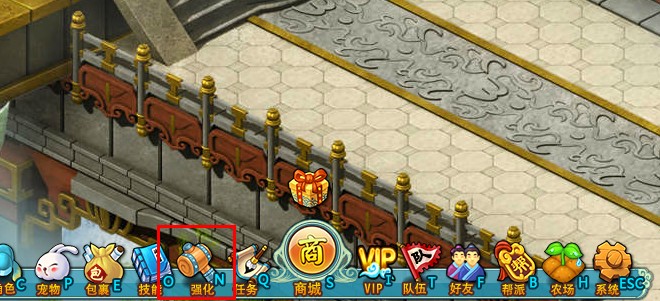 装备或是法宝的升级,是非常简单的,只要有足够的材料,准备好要升级的装备或是法宝就可以了。第一步,点击“强化”按钮。