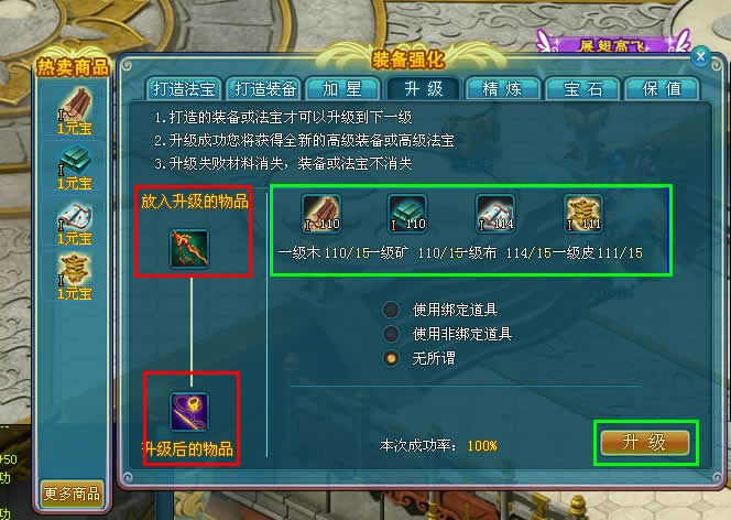 把想要升级的装备或是法宝移动到“放入升级的物品”下的框栏里,“升级后的物品”上的框栏里就会显示出来升级后的物品。玩家可以把鼠标放在“升级后的物品”上的图标处,就会显示升级后物品的各种属性。准备好一级木*15、一级矿*15、一级布*15、一级皮*15,就可以点击“升级”按钮,完成升级。