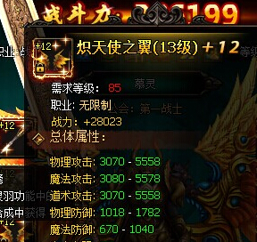 13级翅膀属于属于高阶翅膀了,558的最大攻击以及3070的最小攻击,1782的物理防御以及1040的魔法防御,还有8%的生命加成。