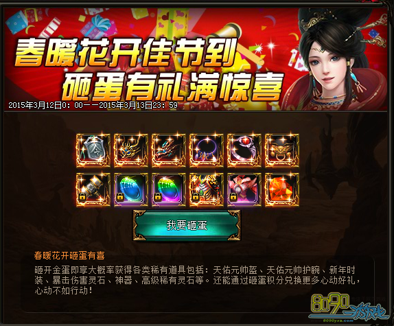 活动内容:活动期间,砸蛋即有海量混元灵石、全新复活玉佩、壕气相送,属性提升再登高峰!更有超高概率获全新天佑元帅装备、补天石、10级稀有灵石、新年时装、完美强化锤等豪华奖励,欢乐惊喜任你轻松赢!幸运值达到100后奖励力度再加倍,狂欢惊喜一触即发!