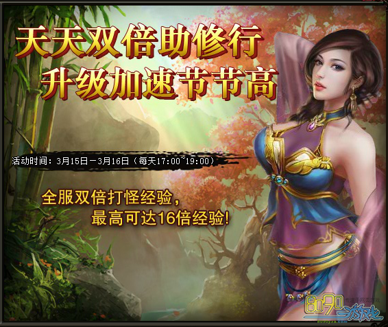 活动内容:佳节期间所有怪物双倍经验,配合8倍经验宝典最高可达16倍经验!让你的等级一飞冲天机会难得不可错过。
