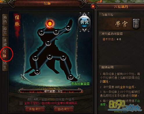 每条经脉拥有10个穴位,10个穴位全部激活后可对经脉进行突破,突破成功后可以进行下一条经脉的激活。