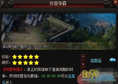 玩家等级到50级开启;有三个阵营,逍遥,太虚,无极;活动时间:19:30-20:00;进入地图后只要不是相同阵营的全部都可以击杀,杀一个人是5分,助杀是2分,积分最高的军团就是阵营争霸的冠军,参加活动的人会获得经验和铜币的奖励。