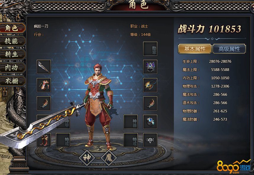 基础属性包括:生命上限、魔法上限、内功上限、物理攻击、魔法攻击、道术攻击、物理防御、魔法防御。