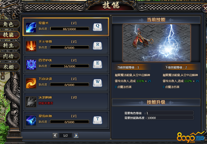驭雷术:凝聚魔法能量,从空中召唤神雷攻击敌人,造成131%+250点魔法伤害;