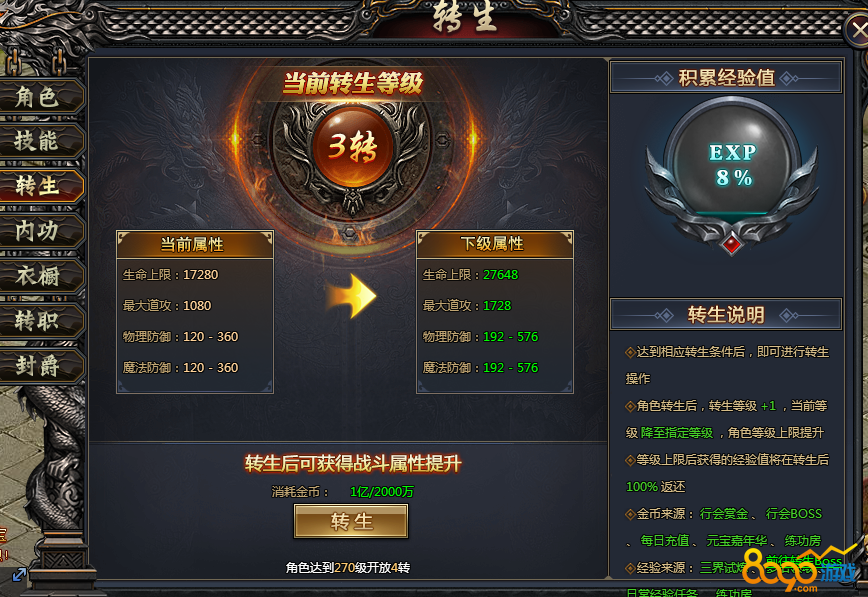 转生之后的属性将有极大的提升,生命上限、魔法攻击、物理防御和魔法防御都将提升到极致。