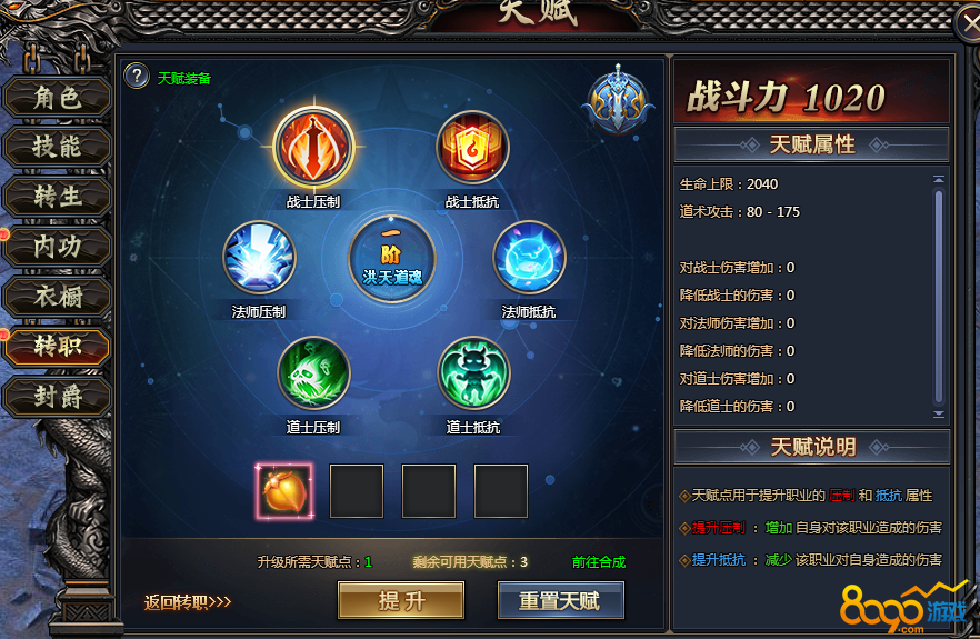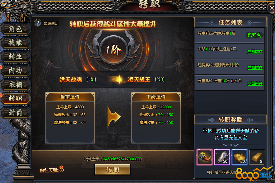 转职后可大量提升战斗属性,同时可前往天赋提升天赋;