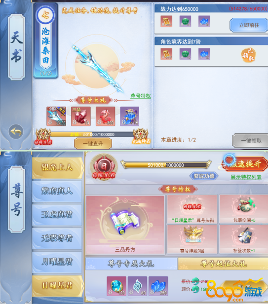 完成一个阶段的任务可以获得更高阶的尊号,越高级的尊号,专属大礼的奖励也会越高,还有超炫酷的称号、包裹空间增加、聚灵时间加成、服用丹号上限等诸多功能。
