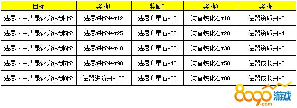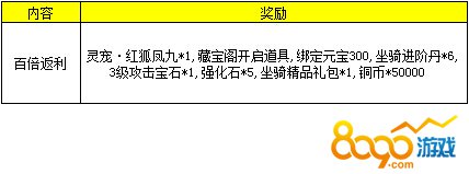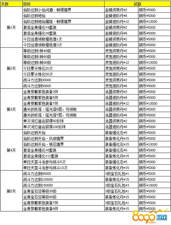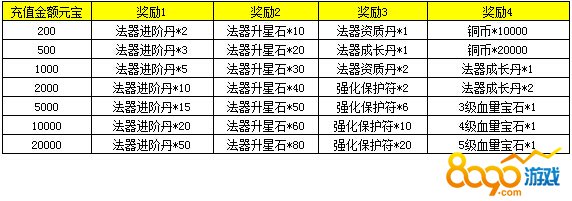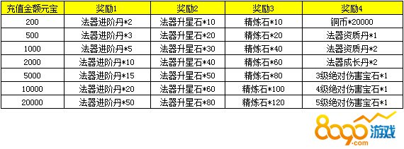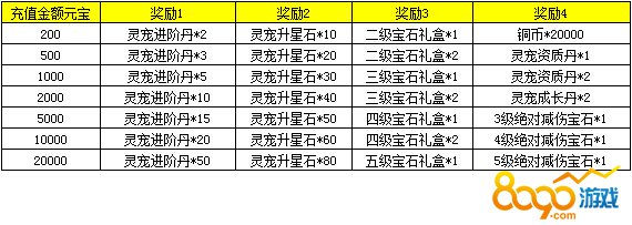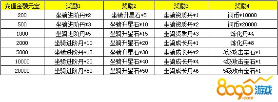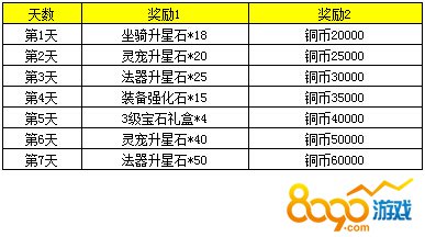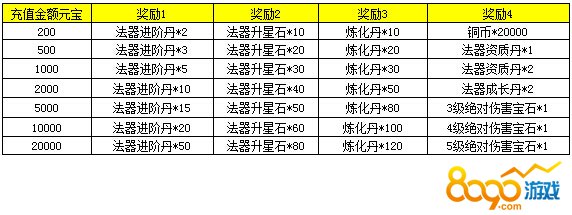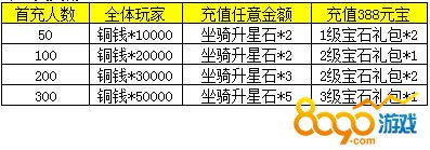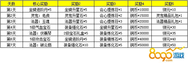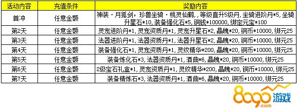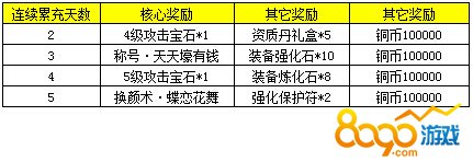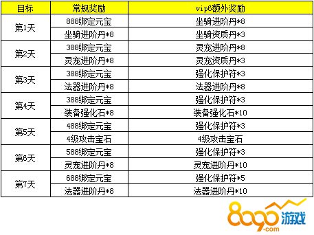 活动内容:开服七天内,每天累计充值888元宝,连续一定天数即可领取奖励