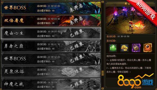 在8090神魔传说中魔由心生是一个每日活动玩法,当大家等级达到60级的时候就可以在每天10:30-10:50这个时间段参加了,全服前20的高手都会化为心魔,击杀心魔就可以获得珍惜道具哦。