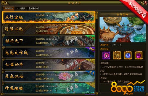 在8090神魔传说中,每天14:30-14:45,等级达到100级以上的玩家即可在活动大厅中直接进入五行宝地副本,活动期间,副本会刷新出5个boss,将其全部击杀即可获得丰厚的奖励,而且每次对boss造成伤害,都有几率获得极品道具哦!