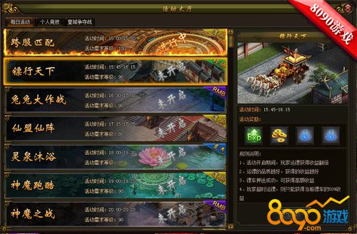 在8090神魔传说中,等级达到90级的玩家,点开活动大厅15:45-16:45这段时间里的每日活动就会看到镖行天下啦!点击参与活动就可以接取镖车了。获得铜钱最大的来源就是押镖了,每天可以押镖3次,根据等级的不同给的铜钱和经验的数量也不一样。