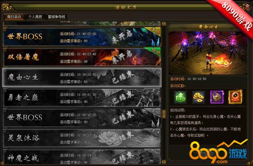 在8090神魔传说中,每天上午的10点30分到10点50分,为时20分钟,点击活动大厅,找到每日活动里的魔由心生,再点击参与活动可就可以进入了,进入之后,副本里全服前20名的高手,将会化身心魔,击杀心魔就可获得大量经验和一些稀有道具。