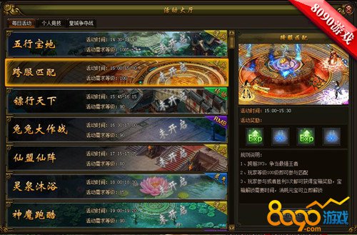 在8090神魔传说中,每天15:00-15:30,等级达到100级的玩家可在活动大厅处参加跨服匹配活动,跨服3v3,人人都有机会争夺最强王者,只要是参与或者是胜利3次都可获得宝箱奖励,而宝箱解锁需要花费一定的时间,但是消耗元宝可立即解锁。