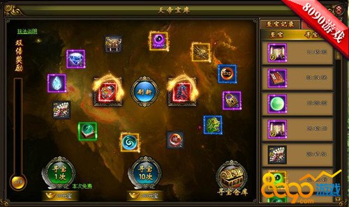 在8090神魔传说天帝宝库中,漂浮着很多道具,玩家可以免费或花费一定元宝来随机寻宝,更有只在天帝宝库中才能寻得的稀有道具,而且每寻宝九次,下次寻宝将会获得双倍奖励。而获得天帝宝库中心的至宝,还会全服广播,展现你的欧气哦!