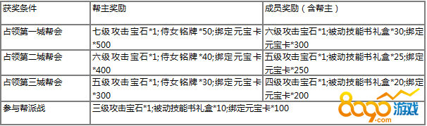 【活动内容】合服后第一场帮派争霸,胜利帮会的帮会能够获得豪华奖励,帮主更是能获的超级奖励;其他帮会的成员也可以获得丰富奖励。