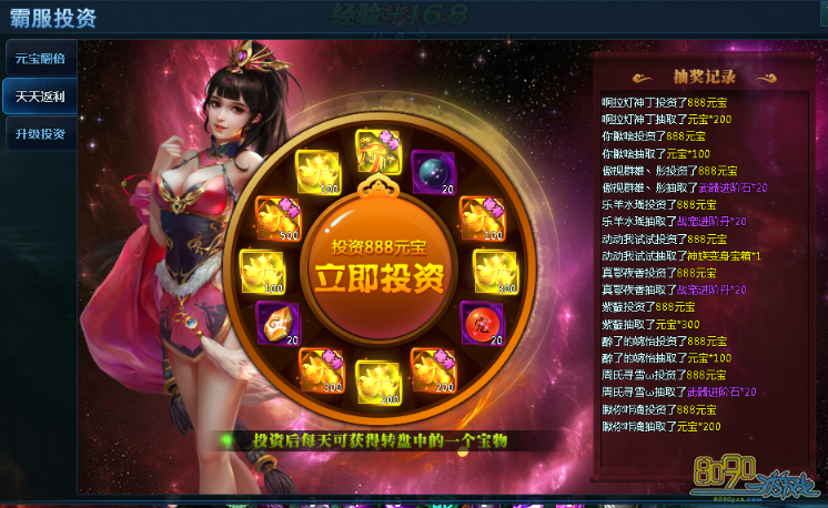 活动内容:投资888元宝,即可获取20倍收益,还将获得神族变身。