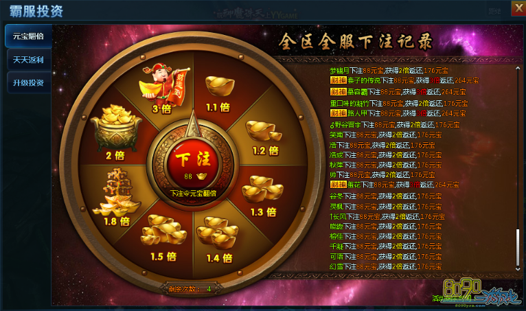 活动五:元宝翻倍,押注一定元宝,最多获得3倍本金的收益!