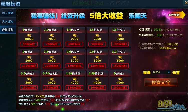 活动内容:投资之后,达到60级时可领取全额本金,之后每升10级就可领取一次大额元宝。满级后的总收益是本金的5倍!