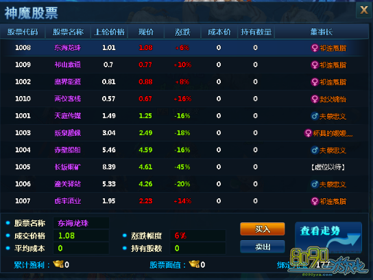 活动内容:使用绑定元宝投资股市,随股价涨跌买卖,坐享成倍收益,赚取大量绑定元宝,还可冠名成为董事长!