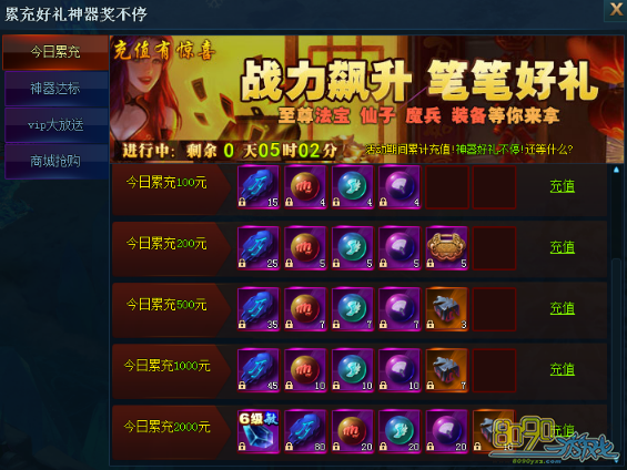 活动内容:每天充值任意金额,可得超值大礼包,大量珍稀道具等你领。