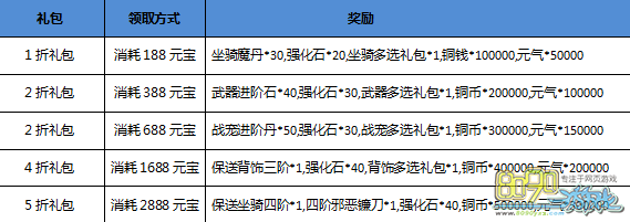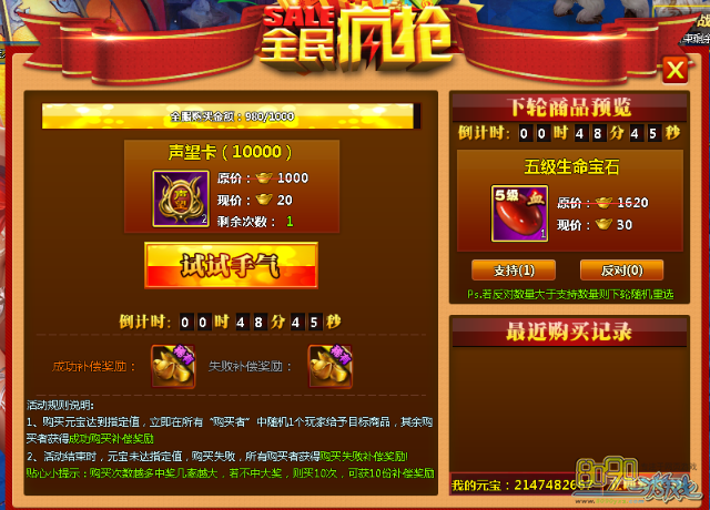 活动内容:打折宝物限时上架,当全服购买总额达到系统出售价格,则成功购买。