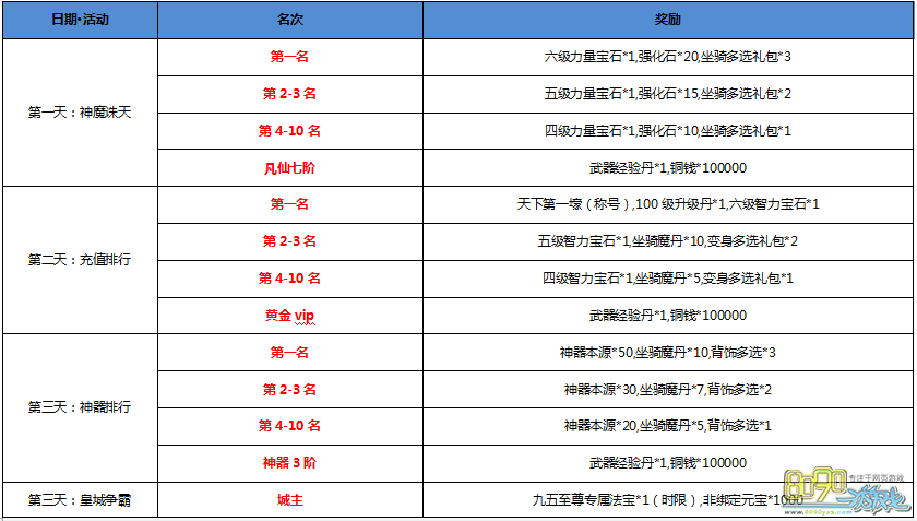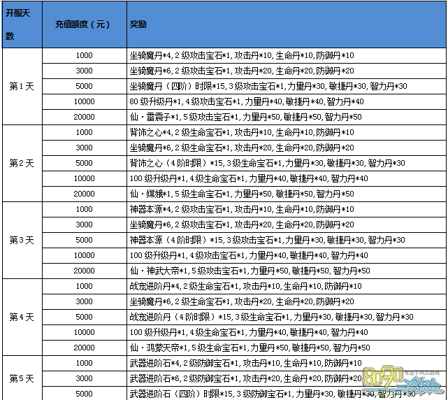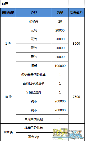 活动内容:首次充值任意金额,即可获得提升大量战力的奖励。