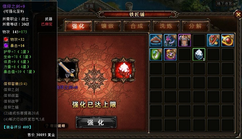每样装备的下面都有此装备可强化的最高数,当强化到此阶段的时候,此武器也就不可以在强化了,当然武器的等级越好强化的等级也越高哟.