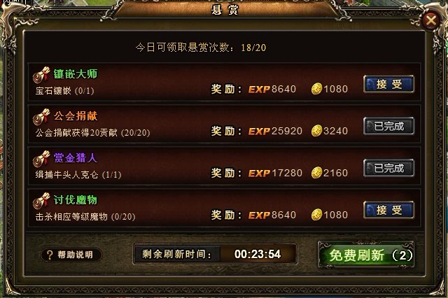 每隔30分钟刷新一次,每天可以免费刷新两次任务,但是免费之后就要付出一点点钻石来刷新.里面的任务都是很好的,没有难度,基本就是送经验的,只是要看你运气好不好碰到的高级任务多不多了.
