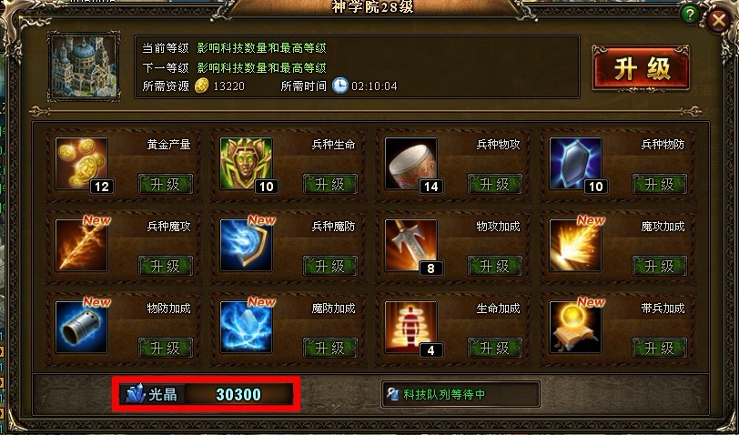 在主城堡的神学院中,里面有很多非常实用的科技都是给主角或是主角所带兵种增加属性的,说到这里就不得不提到光晶的作用了,光晶在《神曲》中是一种升级科技所需消耗的资源。