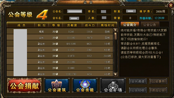 公会的等级提升需要各位成员的捐献。可以点开“捐献”,选择自己想要捐献的黄金数目。以“万”为单位捐献。每捐一万黄金可以获得10点贡献。
