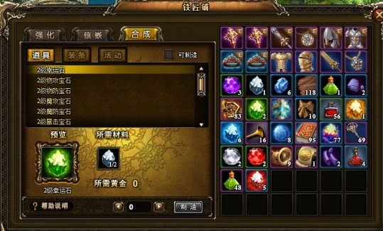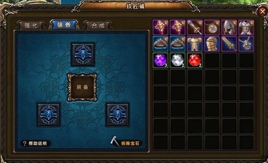 玩家到达16级的时候,铁匠铺便能开放镶嵌这个功能,有孔的装备才能镶嵌宝石,例如项链、武器、衣服、戒指等都可以进行镶嵌。镶嵌不同种类的宝石,可以极大的提升装备的属性,在战斗中能让你的武器成为你的攻击利器,“属性宝石”的出现绝对是打造武器的不二选择。