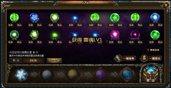 然后你要准备的就是足够的黄金了,然后我们开始进入神秘的神曲占星世界;每位玩家每天可以免费占星一次,之后则需要消耗金币进行占星。在屏幕下方有一排形色各异的水晶球,从左到右级别依次升高,通过水晶球占星可以获得稀有星格的几率依次增加,当然,所消耗的金币数量也依次增多。