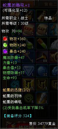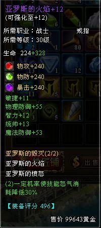 最后则是套装饰品和套装戒指了,每套2个,效果为减少被爆击概率和几率性减少怒气消耗,等级要求为整数级,出产地是地下迷宫,整10数级迷宫boss掉落,虽然套装效果并不立秆见影,但是一来掉落容易,二来实际上效果还是有价值的,只是很难从数据上体现,所以这类套装是值得早早弄齐全的。