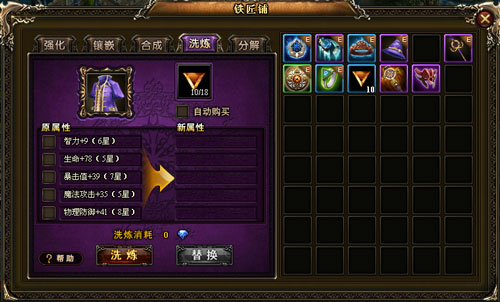 极品装备永远是玩家们追求不懈的永恒目标。“洗炼石”的出现,大大提高了极品装备实现的可能性,玩家可以将非职业的装备在“铁匠铺”分解为“洗炼石”,利用“洗炼石”来刷新装备的属性,直到刷出你想要的属性为止。