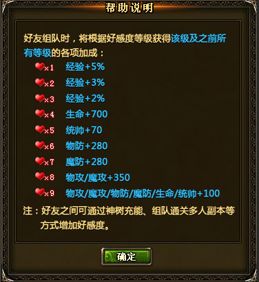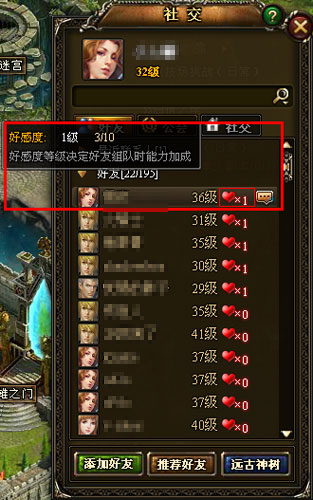 在社交中,红心该表着好友之间的好感程度,“好感度”的等级决定好对组队时能力加成的程度,“好感度”越高,组队副本能力的加成也就越高。“好感度”可以通过“神树充能”来提升。
