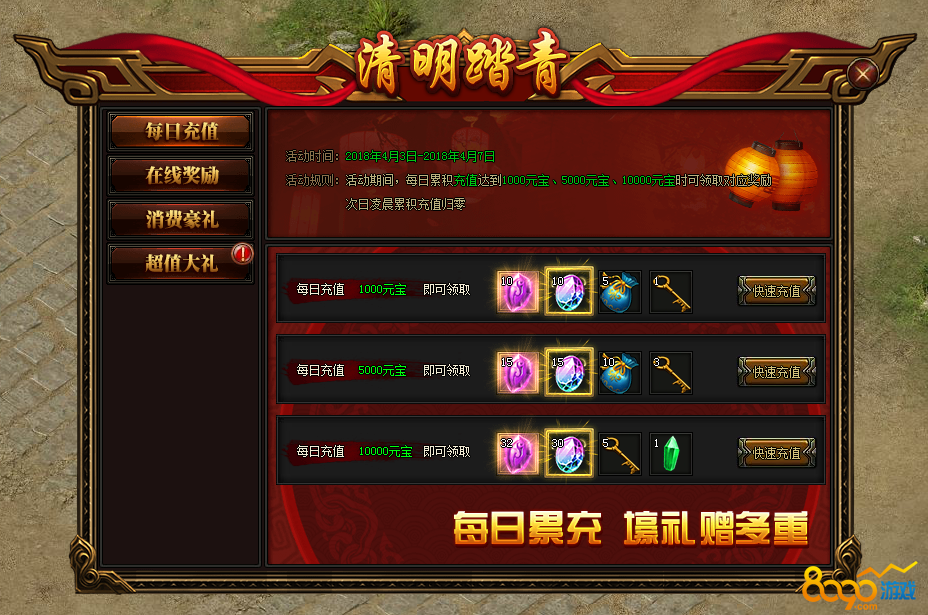 搜索"8090网页游戏"一、 每日累充 壕礼赠多重