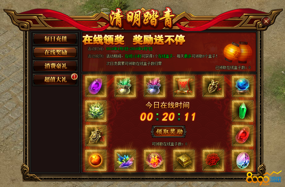 活动规则:活动期间,在线1小时可获得1个在线盒子,每天最多可领取8个盒子,每个盒子可随机获得道具(次日凌晨累积可领取在线盒子归零)