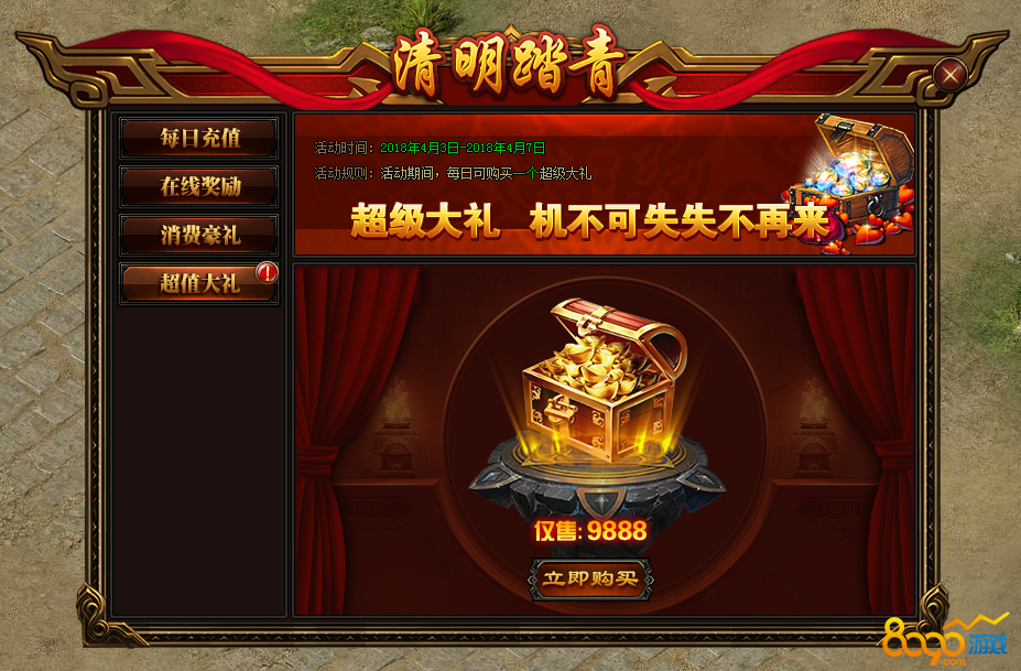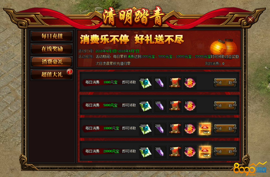 活动规则:活动期间,每日累积消费达到1000元宝、5000元宝、10000元宝、20000元宝时,可领取对应奖励(次日凌晨累积充值归零)