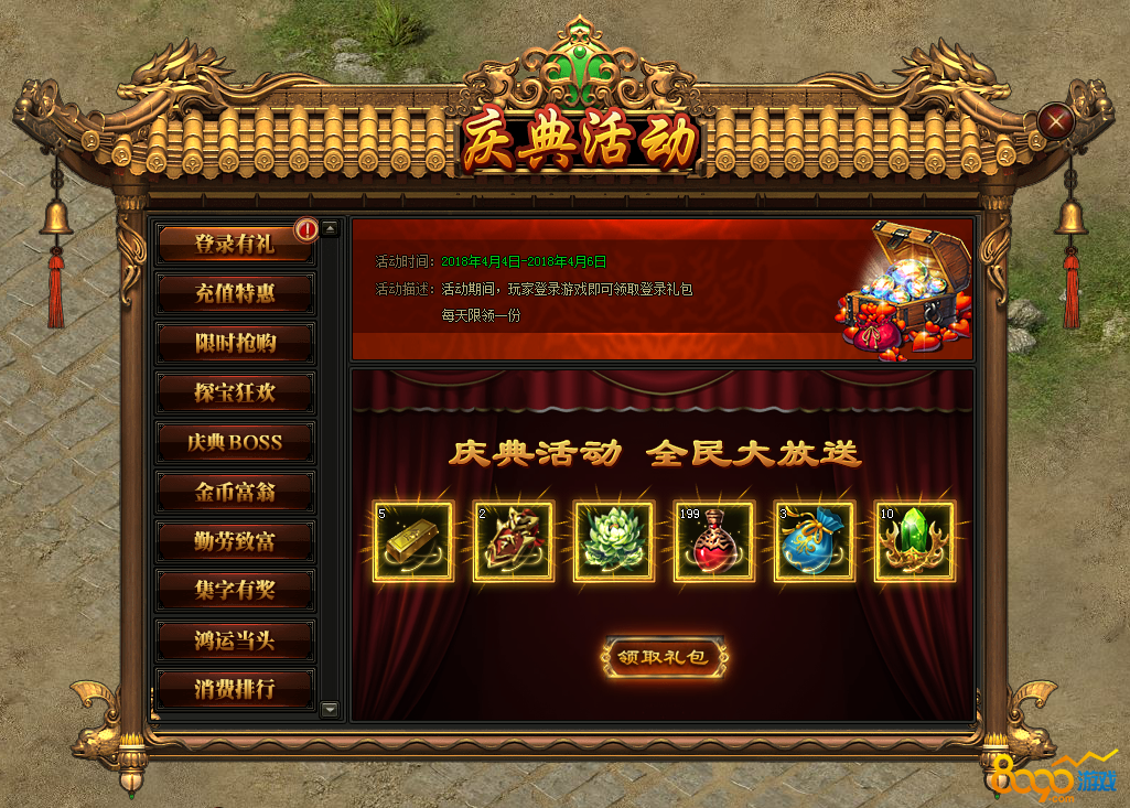 活动规则:活动期间,玩家登陆游戏即可领取登陆礼包,每天限领一份哦!