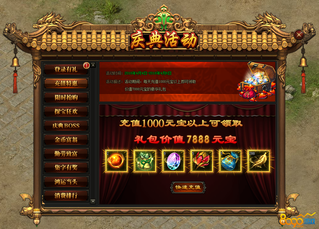 活动规则:活动期间,每天充值1000元以上即可领取价值7888元宝的豪华礼包!