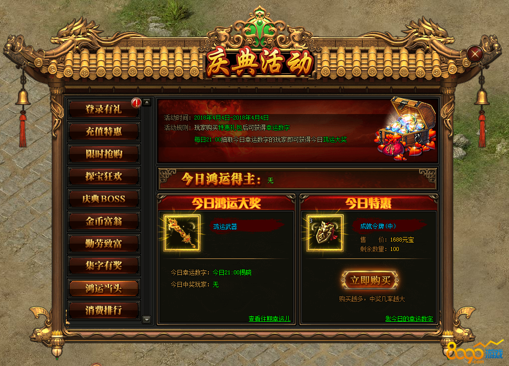 活动内容:活动期间玩家可购买特惠礼包获得幸运数字,每晚21点开奖,获得的幸运数字与开奖数字一样的玩家即可获得今日的鸿运大奖。(每晚21点开奖,21点后购买数字只能得到特惠礼包哦)