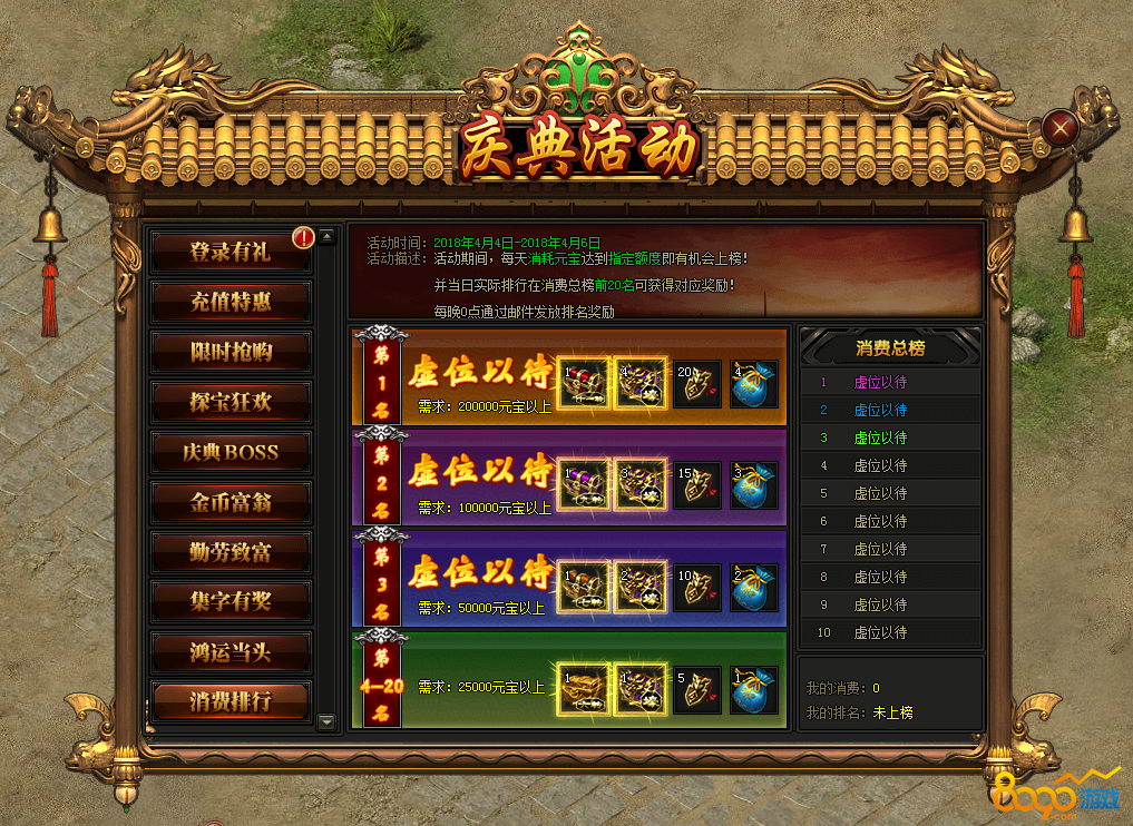 活动内容:活动期间,每天消费元宝达到指定额度即可上榜获得排名奖励!每天0点邮件发送奖励!