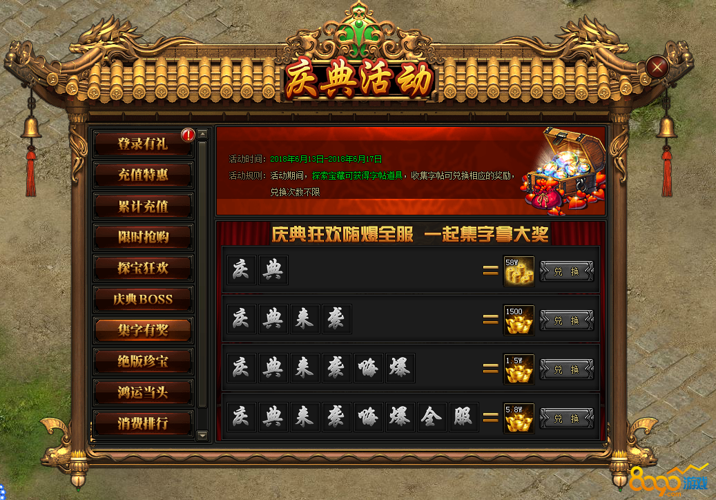 集齐庆典来袭嗨爆全场兑换58000元宝