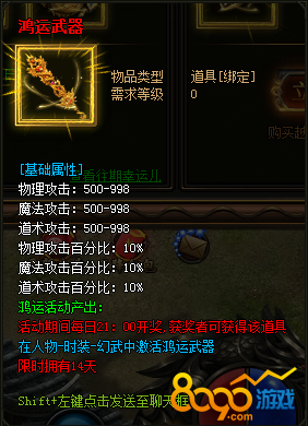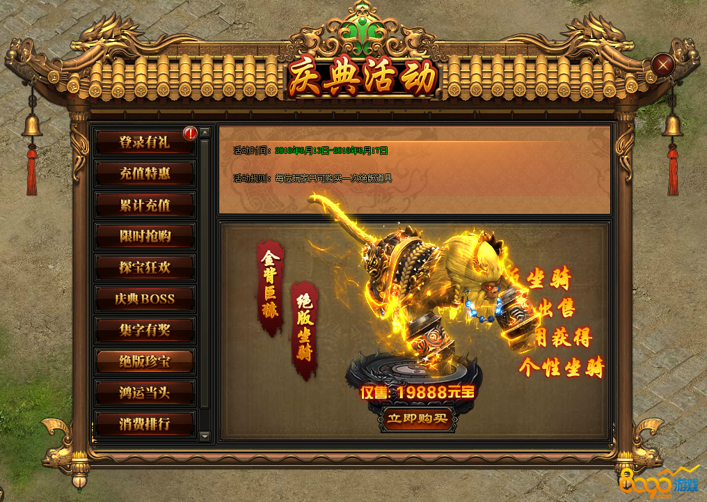 活动内容:活动期间,绝版坐骑“金背巨猿”闪亮登场!注:每件物品每个账号只能购买一次