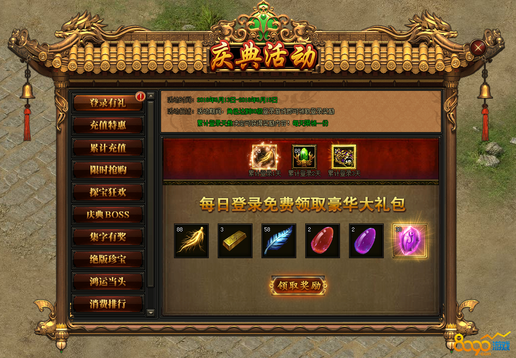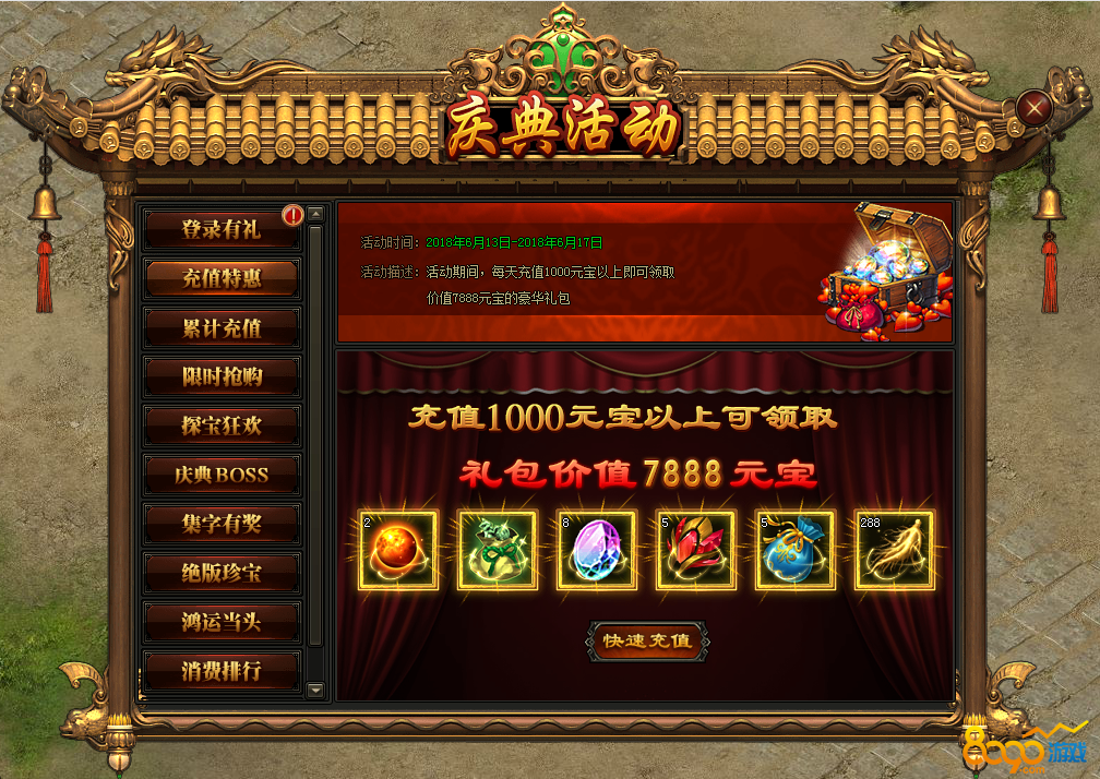 活动内容:活动期间,每天充值1000元以上即可领取价值7888元宝的豪华礼包!