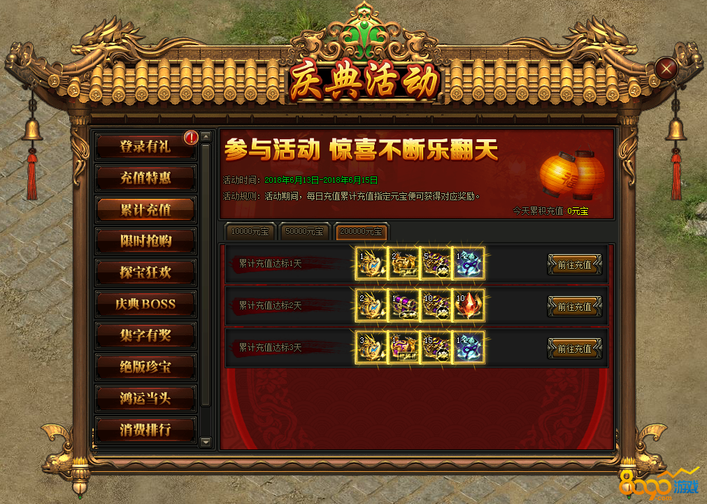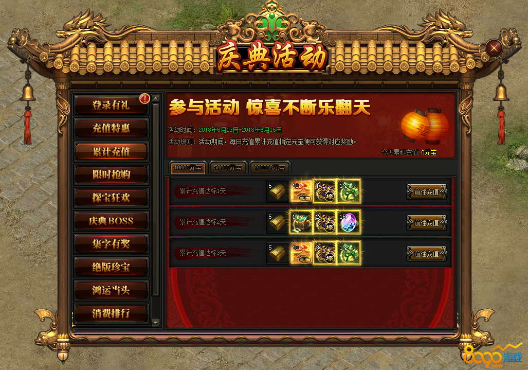 活动内容:活动期间,每日充值累计充值指定元宝便可获得对应奖励。