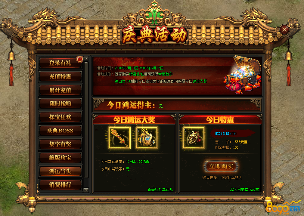 活动内容:活动期间玩家可购买特惠礼包获得幸运数字,每晚21点开奖,获得的幸运数字与开奖数字一样的玩家即可获得今日的鸿运大奖。(每晚21点开奖,21点后购买数字只能得到特惠礼包哦)
